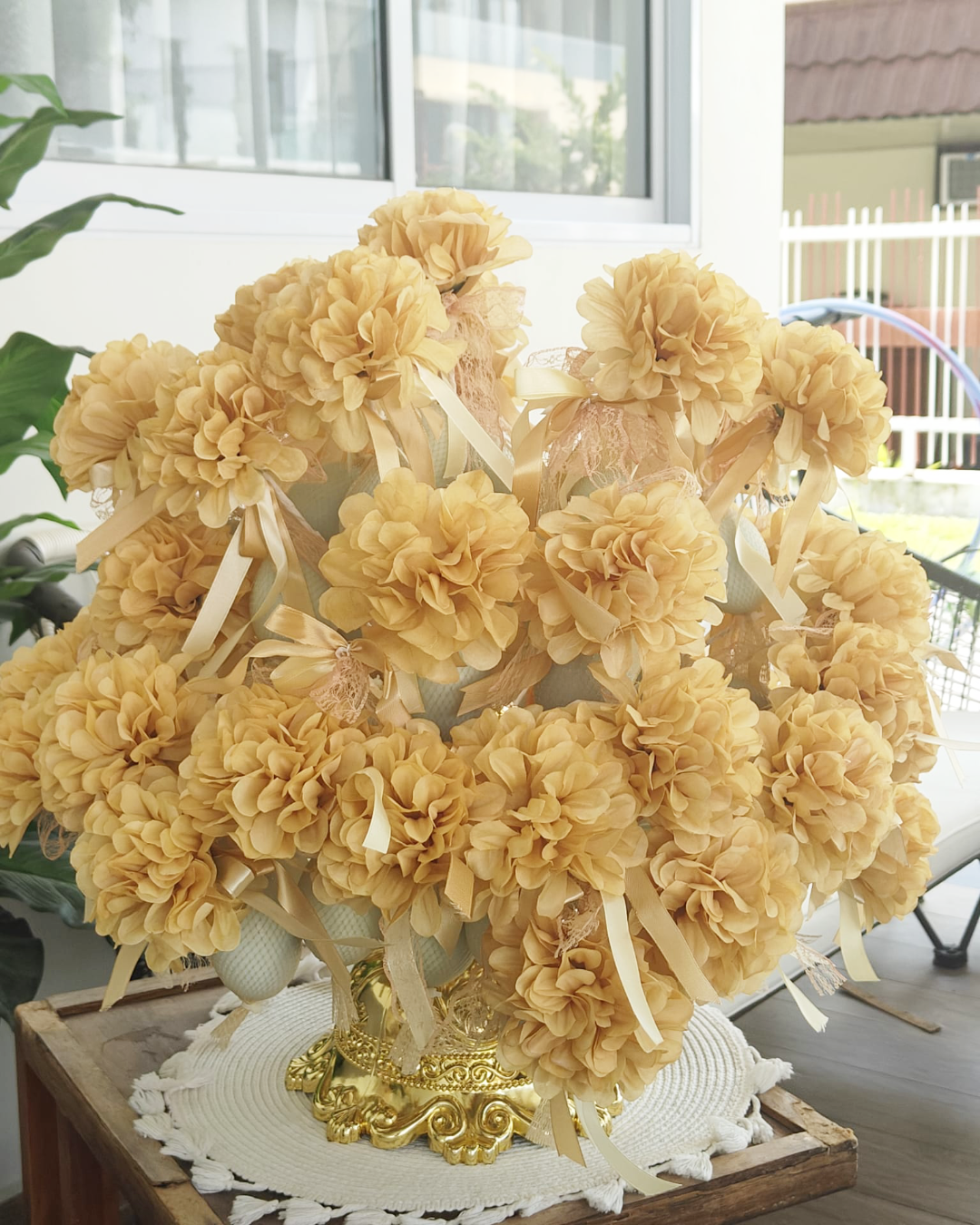 Celebrate tradition in style! Our Bunga Pahar, adorned with salted eggs, brings elegance and cultural charm to your wedding gubahan.