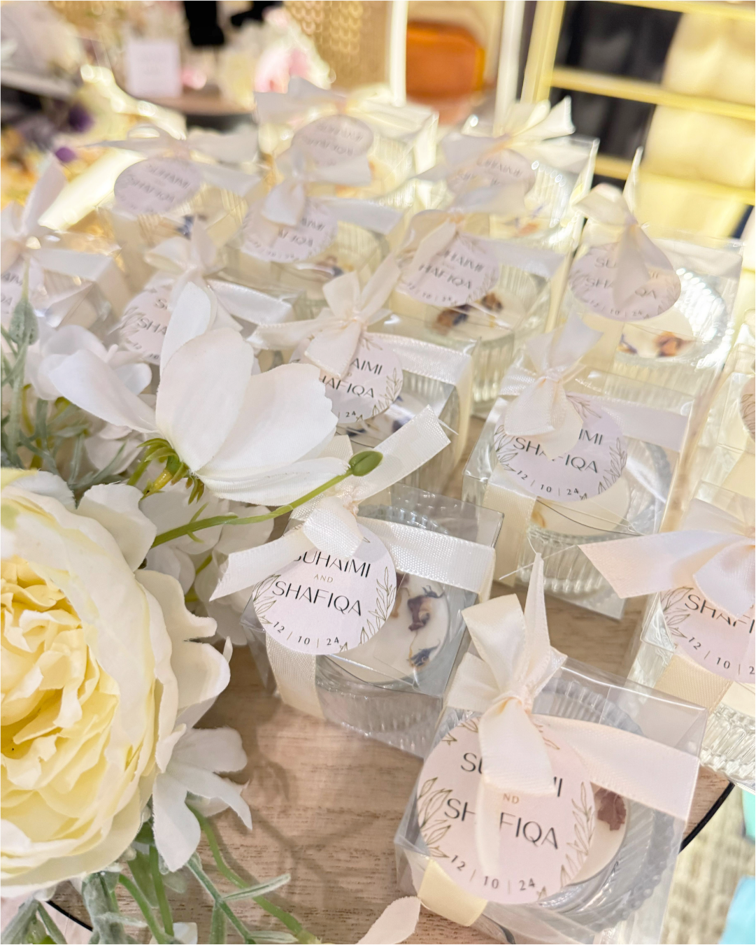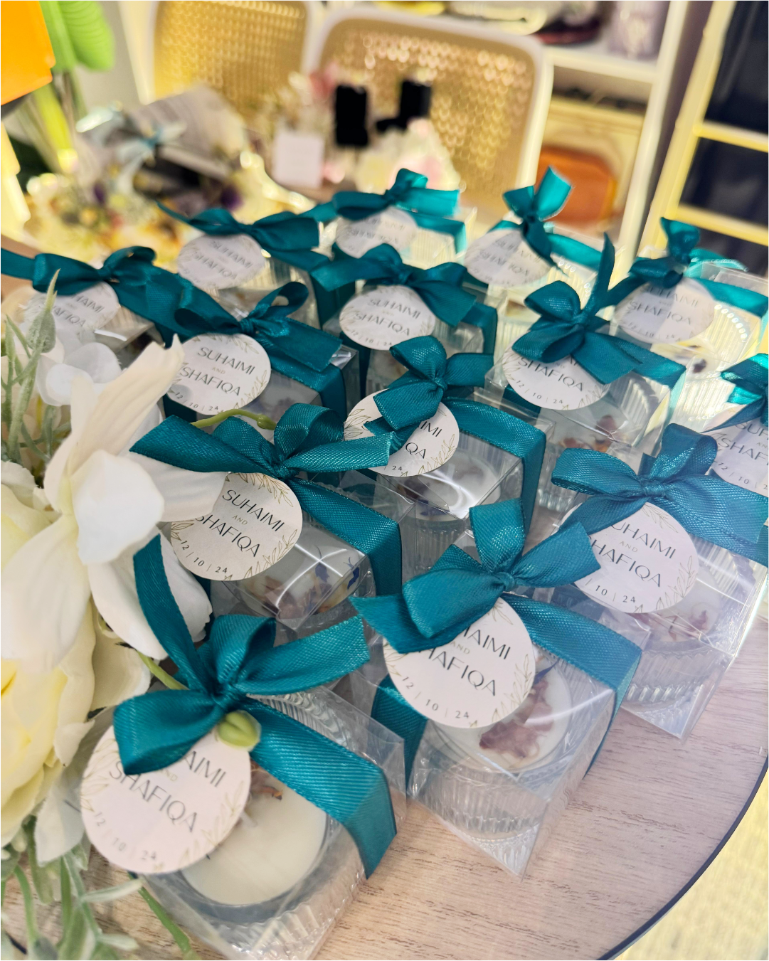 A delicate blend of tradition and charm. This Bunga Rampai comes styled in a clear glass holder with a tealight touch — perfect as a soft, fragrant accent for your wedding trays or guest gifts. Subtle, meaningful, and beautifully timeless.