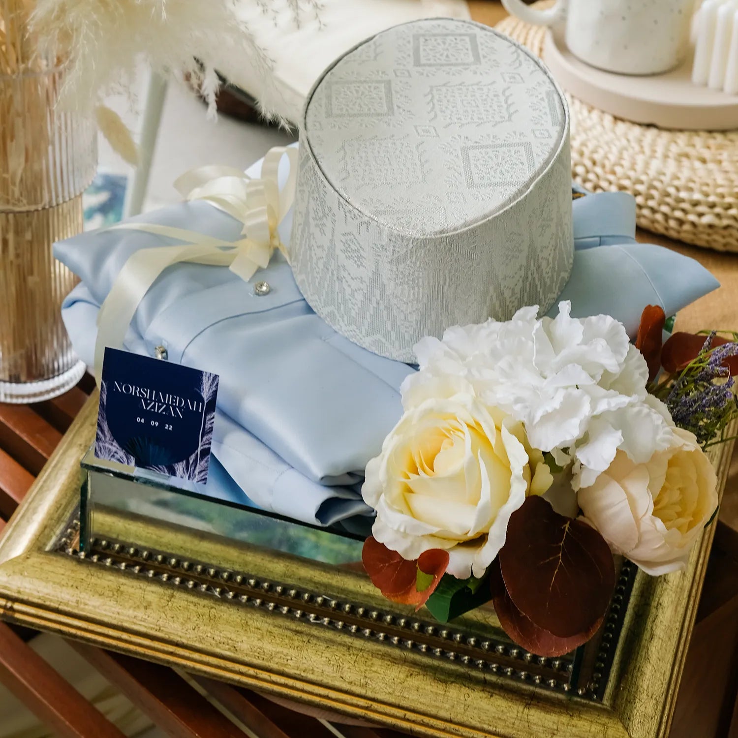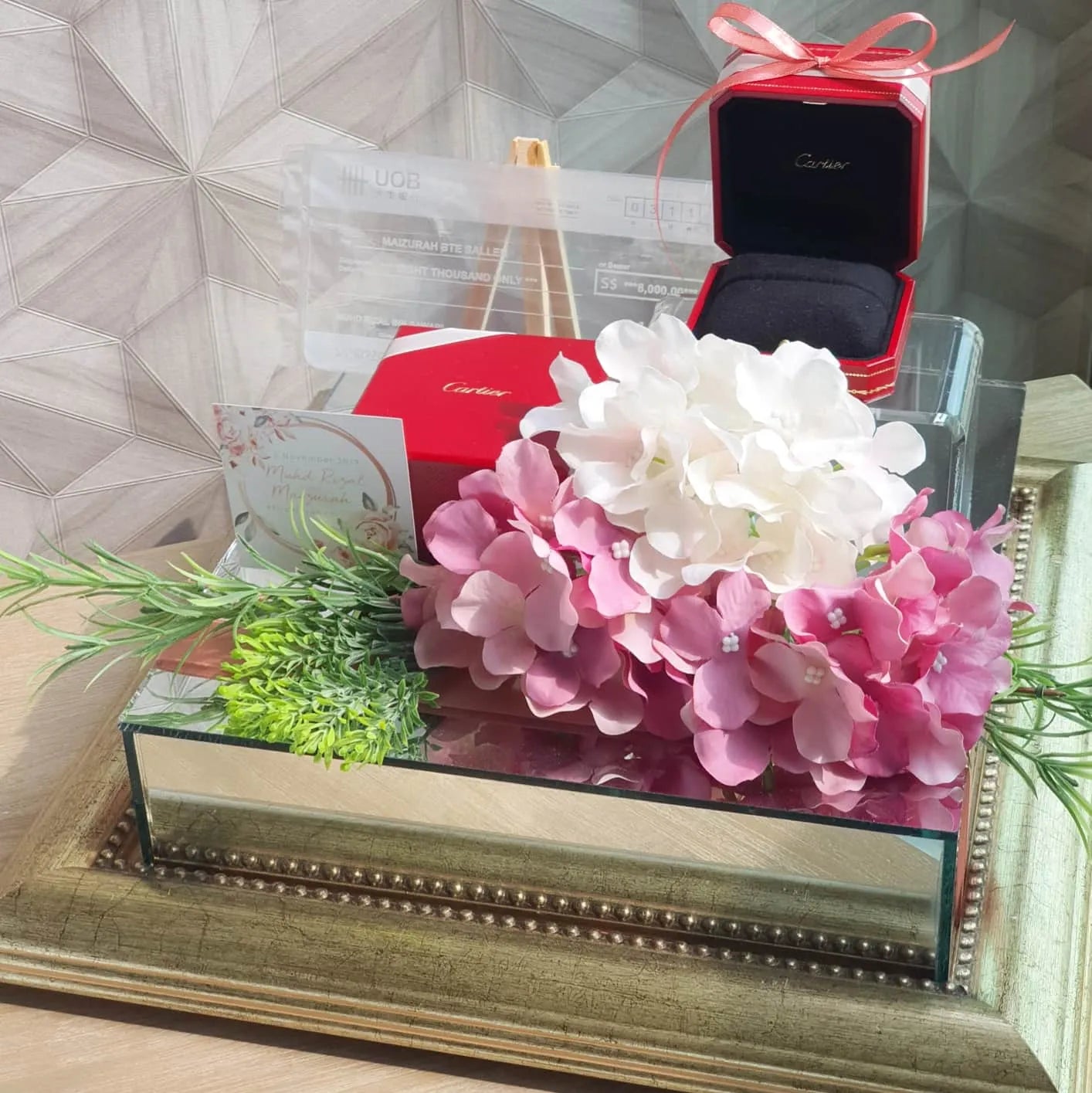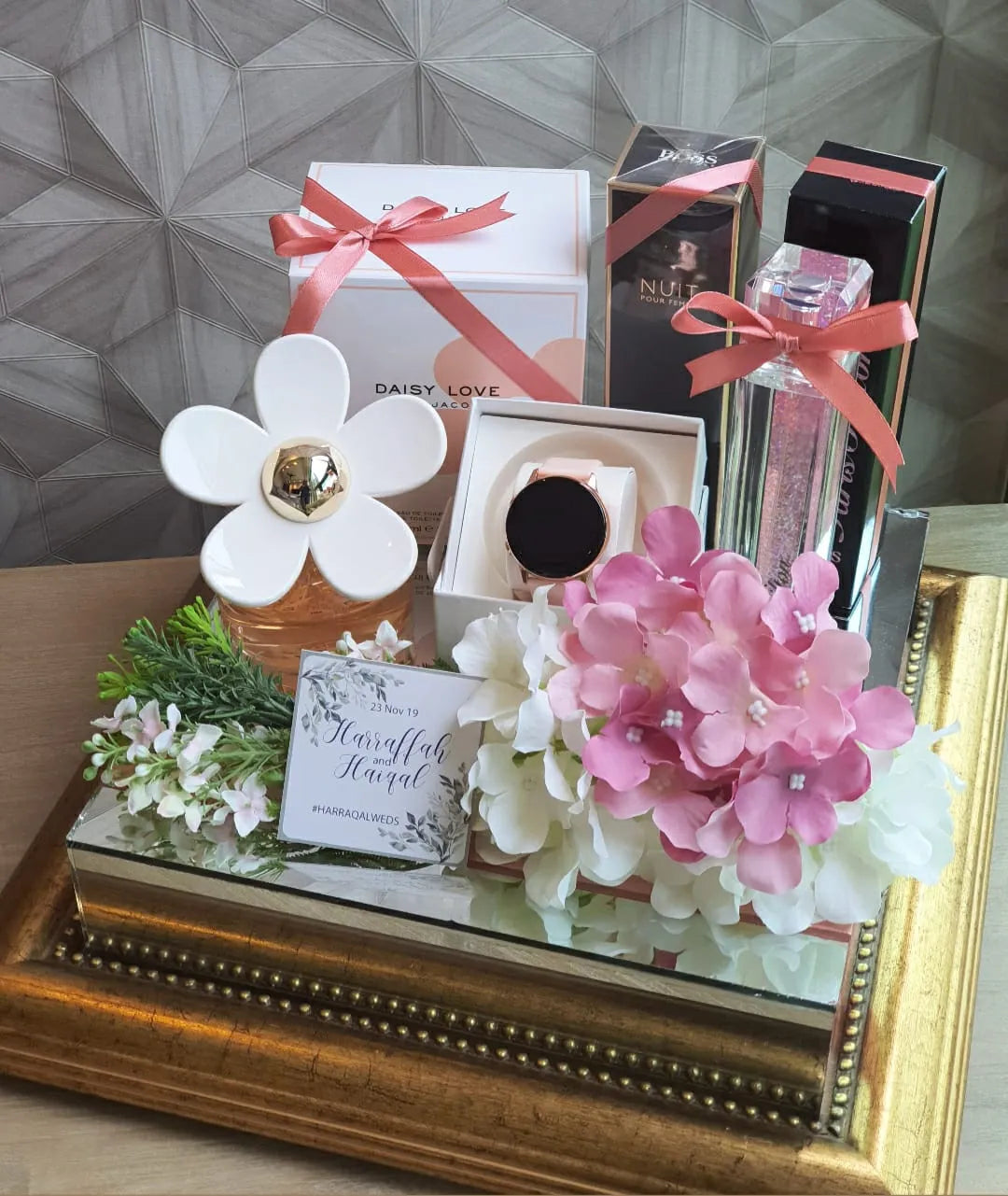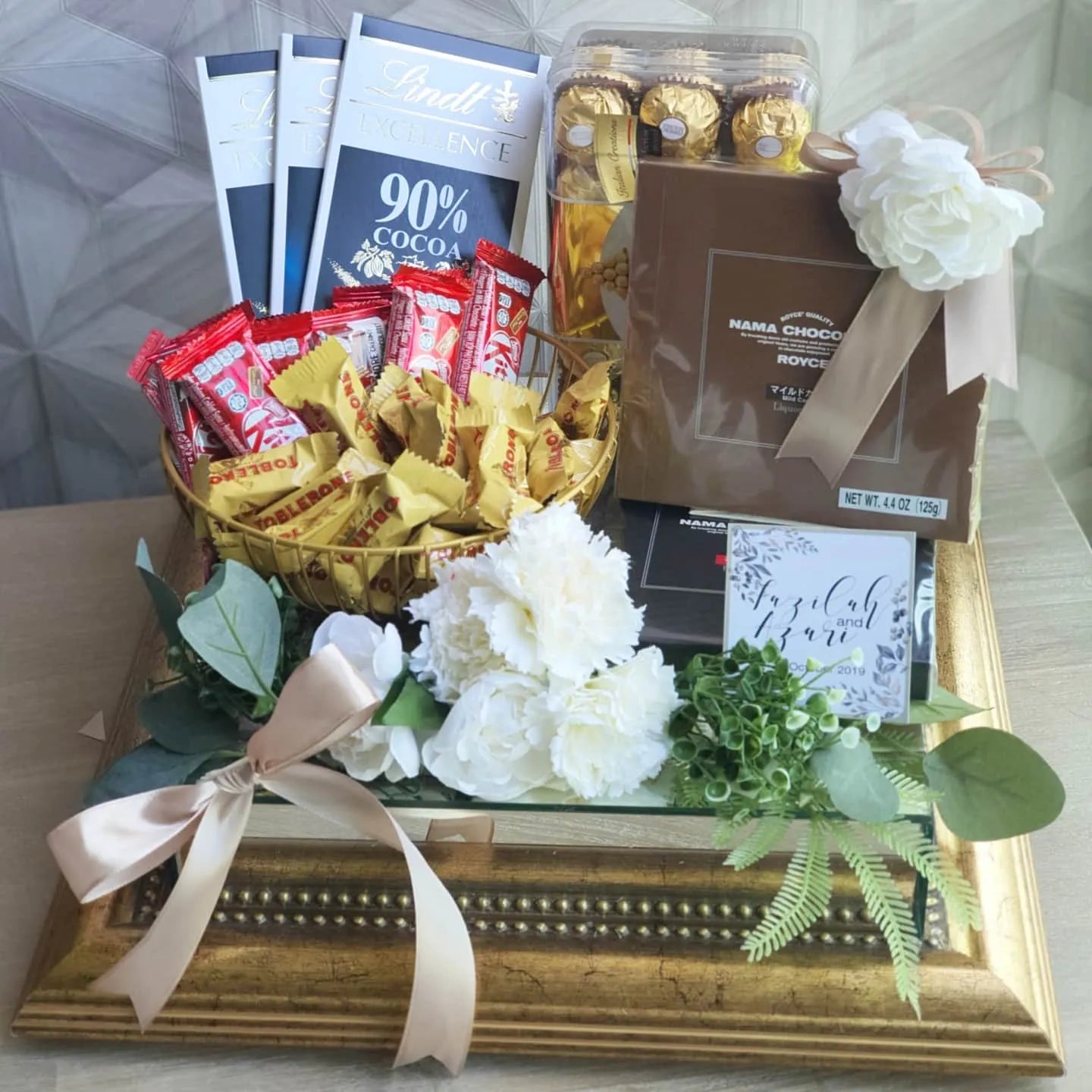 A stunning wedding gift tray featuring a sleek mirrored base in copper or gold. Perfect for elevating your gubahan presentation, it adds a touch of elegance and luxury to showcase your gifts beautifully on your special day.