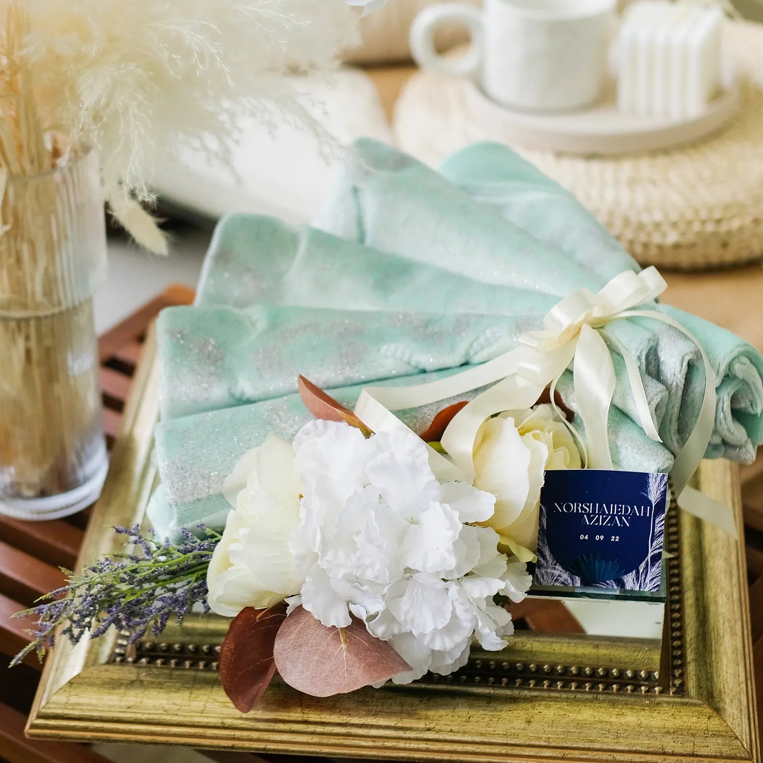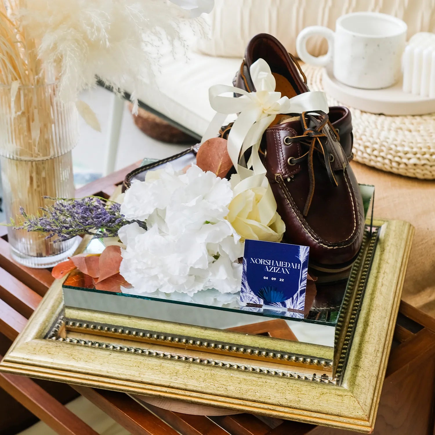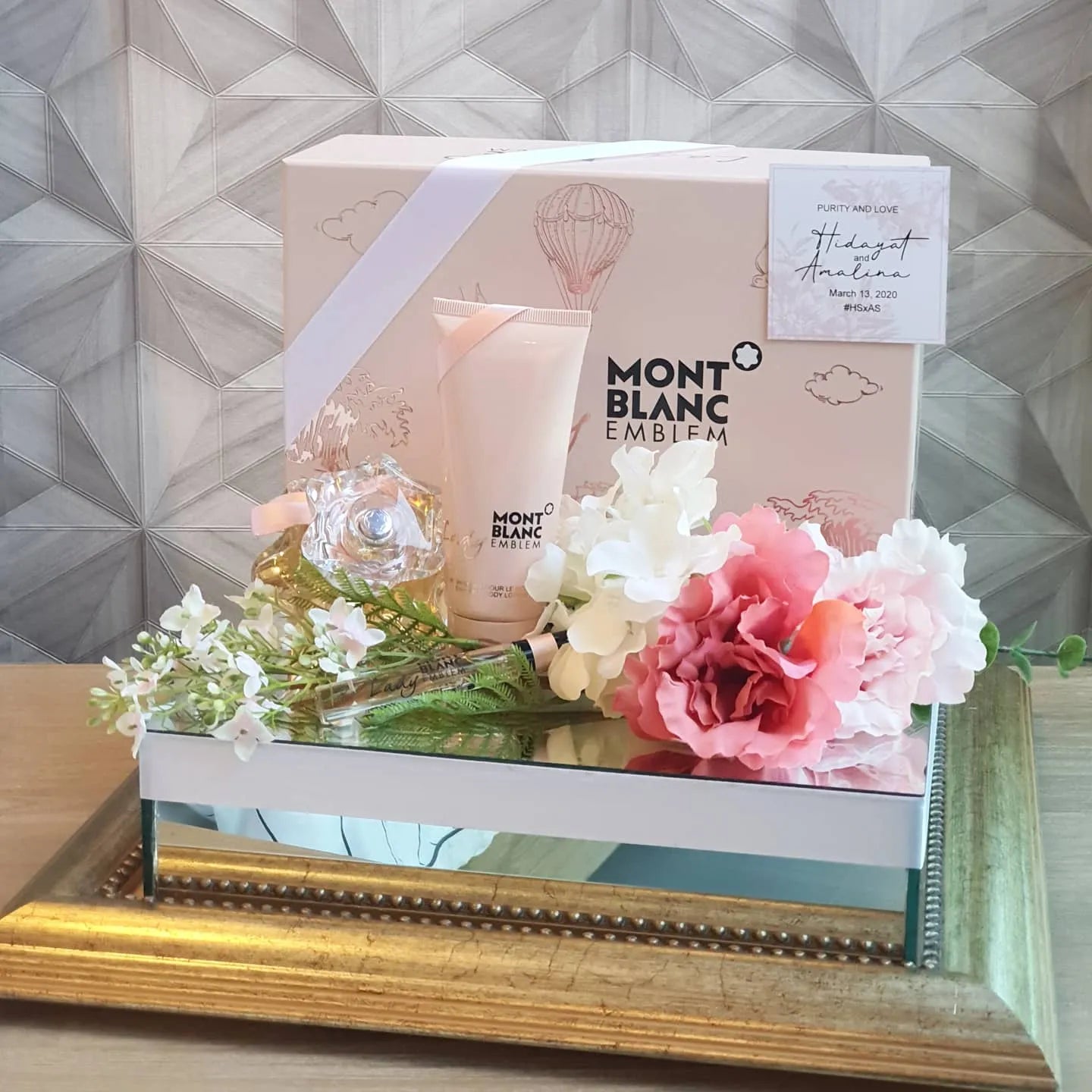A stunning wedding gift tray featuring a sleek mirrored base in copper or gold. Perfect for elevating your gubahan presentation, it adds a touch of elegance and luxury to showcase your gifts beautifully on your special day.