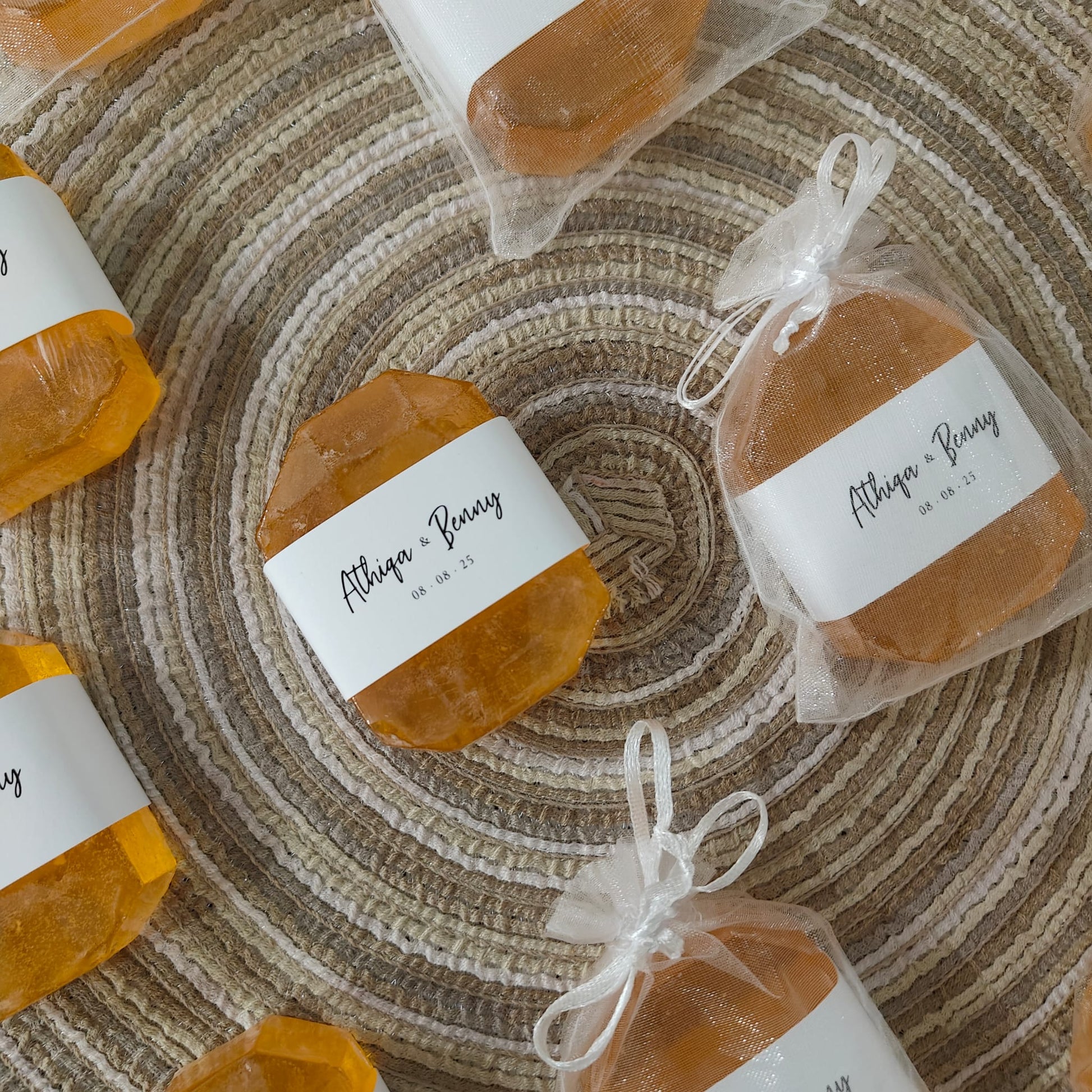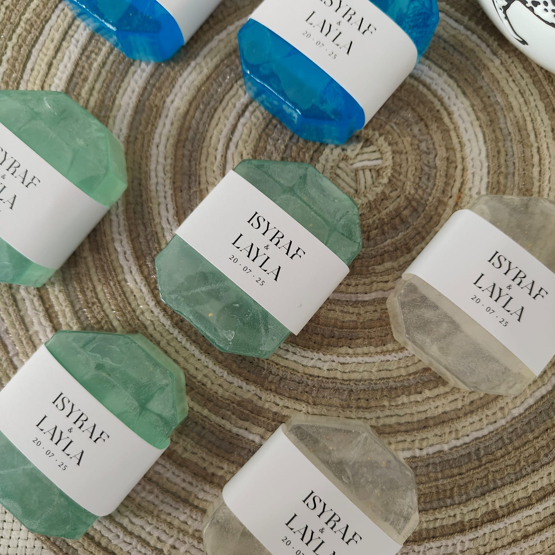 A fragrant touch of elegance. This gem-shaped scented soap is wrapped in a personalized sleeve and placed in a soft organza bag — perfect as a thoughtful and beautifully presented wedding favor or event gift.