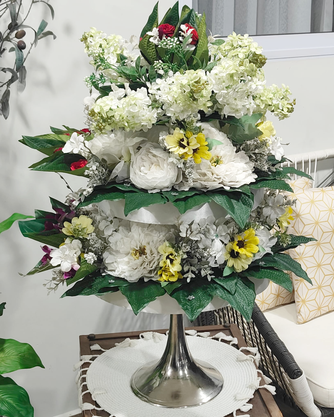 We use faux sireh leaves to ensure the arrangement remains upright and elegant throughout your celebration, a practical touch that preserves the charm and grace of the design.